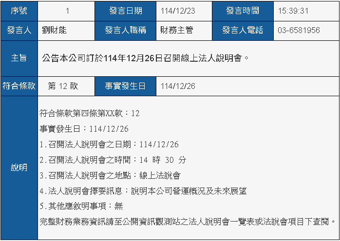 公告本公司訂於114年12月26日召開線上法人說明會。